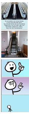 Explore and share the best escalators memes and most popular memes here at memes.com. See, rate and share the best escalator memes, gifs and funny pics. Lololololol xd you are so right dude hahaha that made me laugh ha good thing i wasnt reading this while going down the escalator or else i would have tripped. Escalator fails try not to laugh, sliding down rooftop death stairs, funny video of dog is scared of escalator shorts memes, jesus take the escalator, coffin dance meme compilation funeral dance. An escalator can never break, it can only become hilarious.