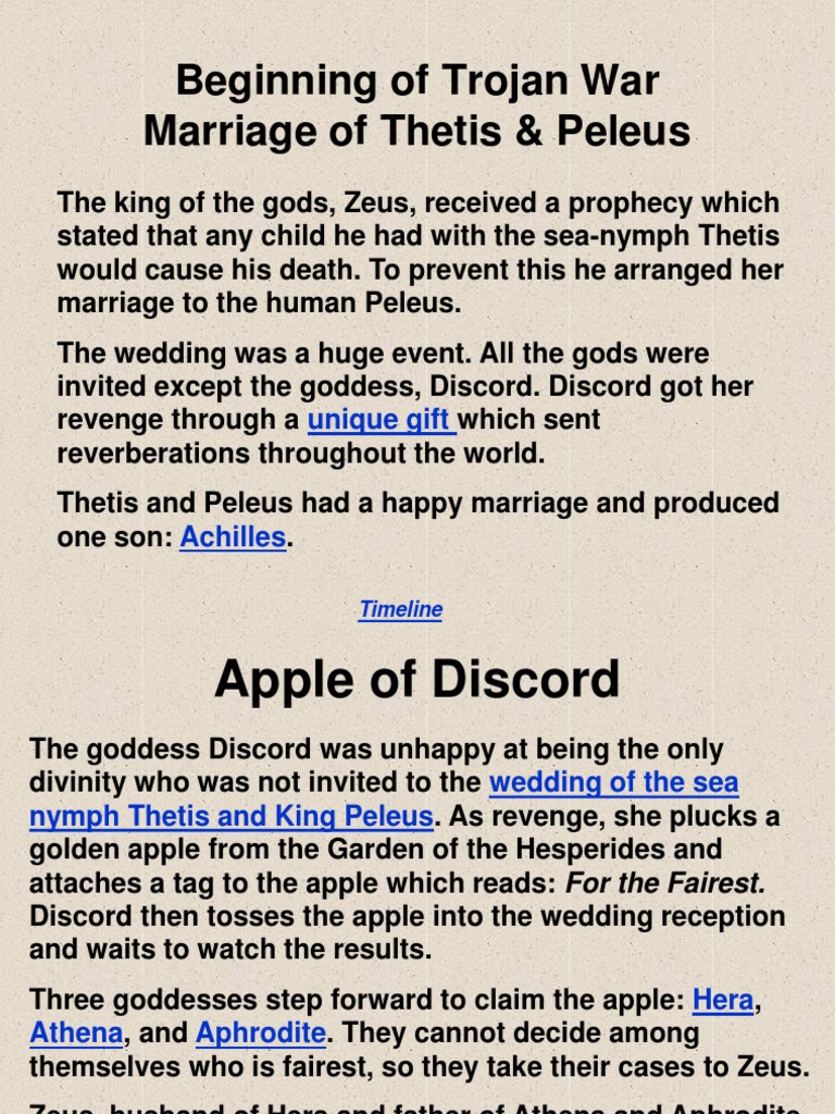 This video was made for educational purposes only; The apple of discord the origins of the trojan war can be traced back to peleus and thetis' marriage because eris, goddess of discord, was not invited, she threw a golden apple on a table at the wedding after aphrodite, hera, and athena reached for the apple, paris was chosen to choose the most beautiful paris chose aphrodite, and consequently. In return for paris' judgment, aphrodite promised paris the most beautiful woman in the world, helen. Epimetheus prometheus atlas = pleione gaia (earth) uranus (heaven) iapetus (titan) = clymene oceanus = tethys themis pluto. Trojan war, legendary conflict between the early greeks and the people of troy in western anatolia, dated by later greek authors to the 12th or 13th century bce. But there's much more to the ancient myth of troy. Until about a 100 years ago, we were quite sure that the trojan war was purely legend, and that asking when it happened would be like asking when atlantis sank. If a trojan war did happen, it was likely a lot different than the one that homer describes in his epic poems. The ancient greeks defeated the city of troy. Paris stayed at the home of menelaus and was invited to a feast, where he laid eyes on helen, and later that night, paris kidnapped helen and menelaus was devastated. The trojan war started after an incident at the wedding feast of peleus, the king of thessaly, and thetis, a sea goddess. The greeks imagined the war to have occurred some time in the 13th century bce. Both began within the oral.